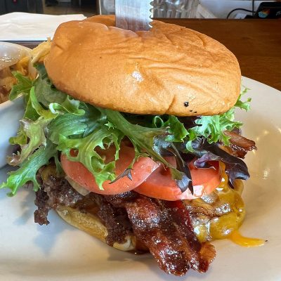 INGREDIENT 411: Two 3 oz. Angus patties, bacon, cheddar, lettuce, tomato, grilled onions, mayo and BBQ sauce. Your choice of side: fries (garlic fries +$1.50), salad, seasonal fruit, or chili.